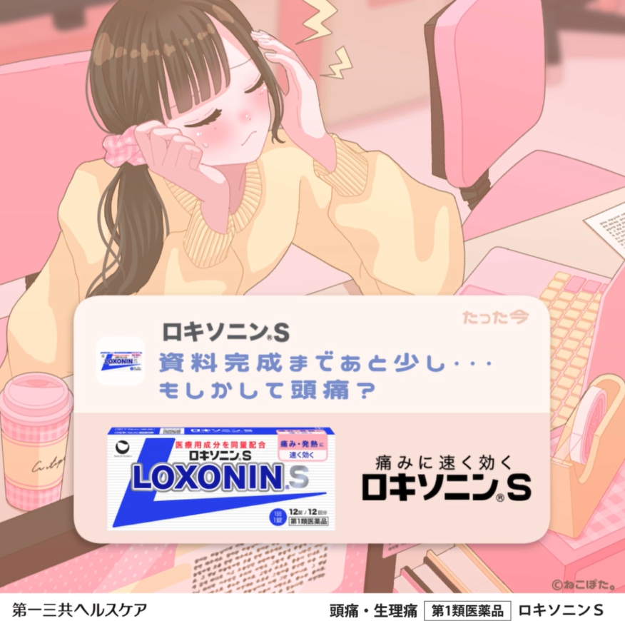 デスクワーク、旅行中、ゲーム中と様々なシチュエーションで起こる、 頭痛に悩む女性のイラストを手がけました。